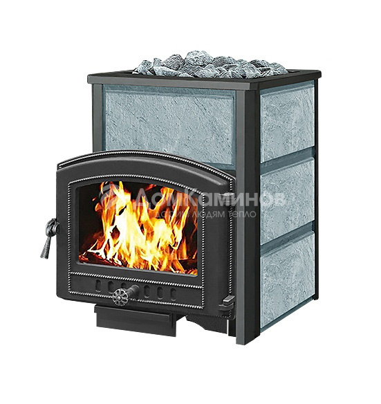 Конвекционно–вентилируемая облицовка, изготовленная из экологически чистой горной породы , который обладает большой теплоёмкостью, что позволяет камню в короткие сроки нагреваться и максимально долго удерживать стабильную температуру в парильном помещении, а также гасить жёсткое инфракрасное излучение Камень обладает исключительными лечебными свойствами: помогает при головных болях, при нестабильном артериальном давлении, при простудных заболеваниях, воспалительных процессах в почках и пищеварительной системе, снимает повышенную возбудимость и нервозность, сглаживает эмоциональные всплески. Облицовка из натурального камня при нагреве способна аккумулировать тепло, что гарантирует максимально равномерный прогрев и сохранение тепла Банная печь ЛЕГЕНДА 16 (224) укомплектован чугунной каминной, самоохлаждаемой дверцей Везувий 224 с большим жаропрочным стеклом «SCHOTT ROBAX», с оборудованной системой самоочистки, что позволяет визуально контролировать горение и любоваться видом живого огня. Данная печь рассчитана на объем парильного помещения 8-18 м3.