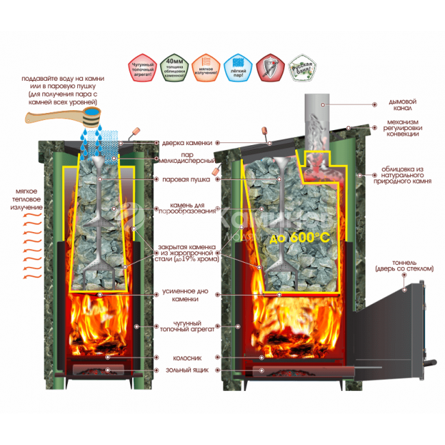 - наличие на каменке дверки также позволяет эффективно управлять распределением тепловой энергии либо на нагрев камней при закрытой дверке, либо на приоритетный нагрев помещения при открытой дверке;