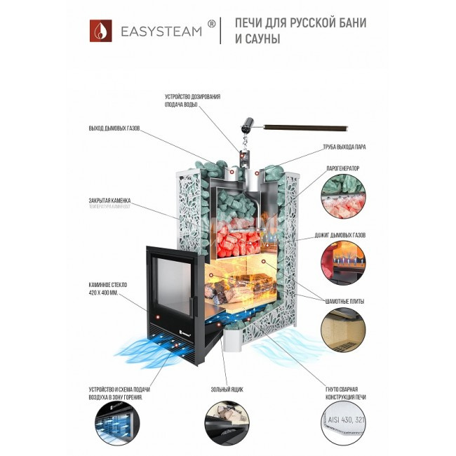 С терморегулирующей задвижкой, позволяющей максимально рационально использовать тепловую энергию и разогревать камни до температур 550-650 °C.
