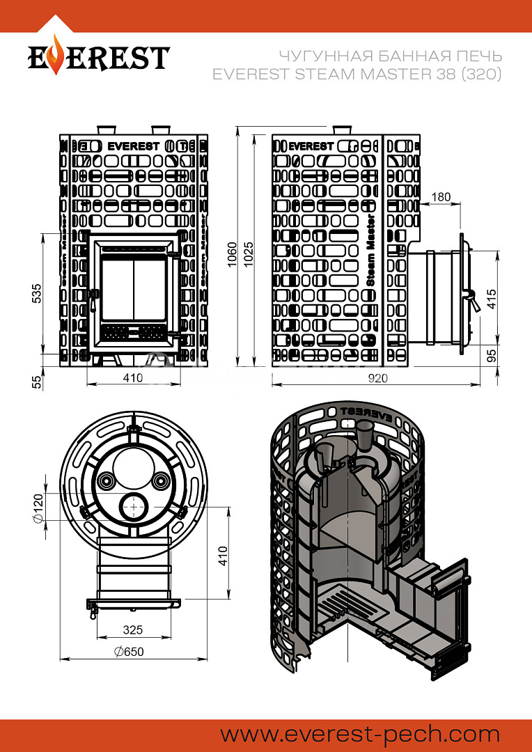 Банная печь Эверест "Steam Master" 38 (320) ЧУГУН предназначена для нагрева помещений и получения пара в парных объёмом до 38 кубических метров.