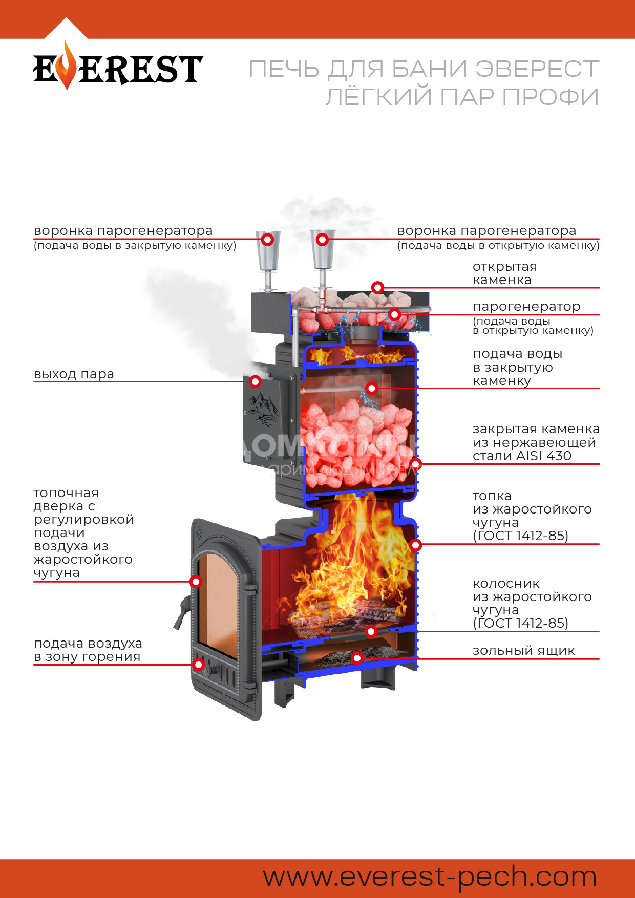 Поворотная чугунная банная печь EVEREST Лёгкий Пар ПРОФИ предназначена для обогрева парных помещений объёмом до 44 кубических метров и получения пара при эксплуатации в частных и коммерческих банях.