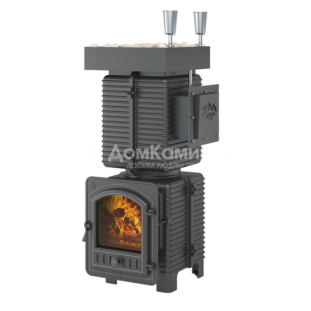 В качестве открытой каменки выше основной части печи может быть размещён стальной поддон для камней, куда умещается более 60 кг камня. Совокупный вес печи и заклада составляет более 400 кг.