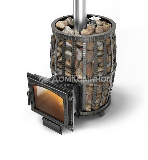 Вода подается в самую горячую центральную часть закрытой каменки через воронку (при этом дверь закрытой каменки должна быть приоткрыта для поступления мелкодисперсного пара в парное отделение) Все элементы топки отлиты из чугуна и соединены между собой с помощью болтового соединения через термостойкий шнур и герметик, а закрытая каменка изготовлена из жаростойкой высоколегированной 4 мм нержавеющей стали.