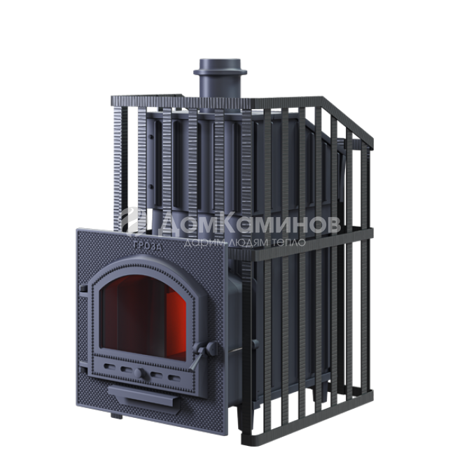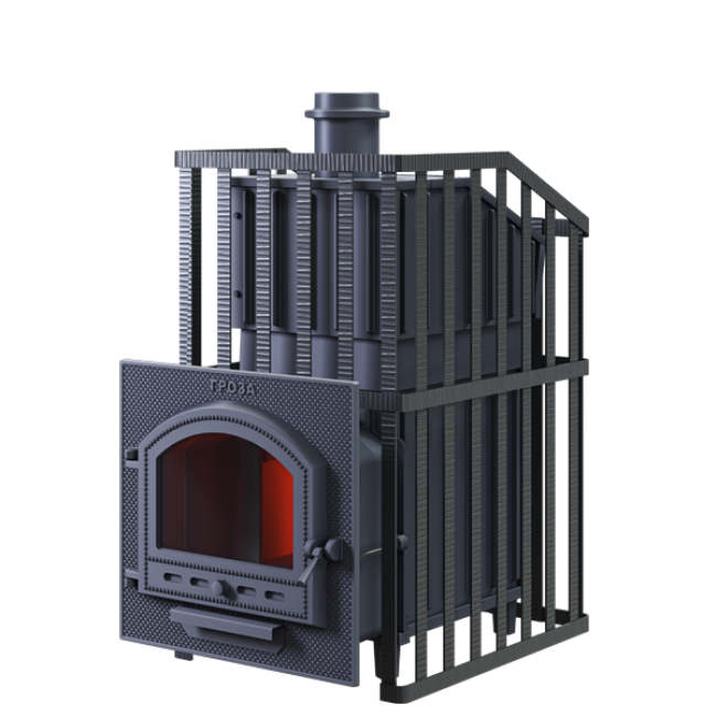 Печь для бани Гроза Ураган - расширенный комплект печи в сетке. Максимально приближенный вариант печи для режимов русской парной, имеющий непосредственно закрытую чугунным коробом каменку, дверцу для пара с ручкой из бука, увеличенную до 50 см чугунную стартовую трубу. Печь легко модернизируется до полноценной печи предназначенной для Русской бани путем замены стальной сетки на каменную облицовку без демонтажа дымохода. Модель Гроза Ураган выполнена на базе топочного агрегата Гроза - экономичная модель для частного применения. Основной принцип работы печи сохранён – получение пара с теплоёмкой каменки прямого нагрева. Каменка является сводом топки, нагревается с нижней поверхности снабженной теплосъемными шипами для увеличения контакта с пламенем.