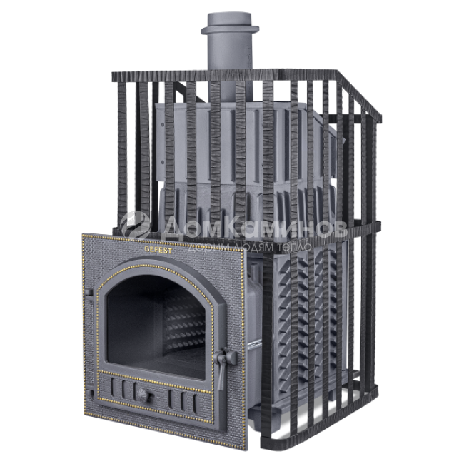 Печь легко модернизируется до полноценной печи предназначенной для Русской бани путем замены стальной сетки на каменную облицовку без демонтажа дымохода.