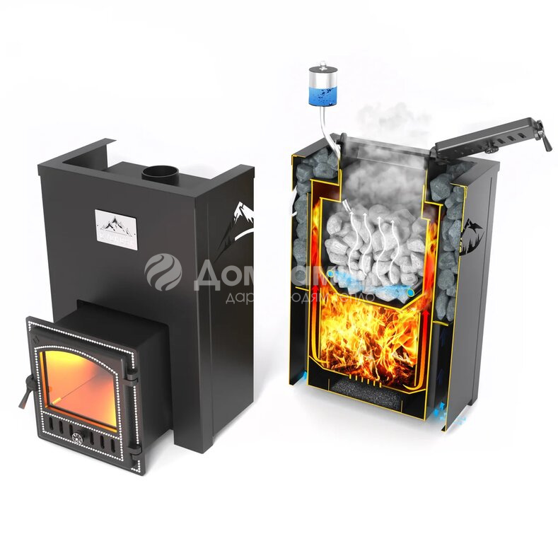 Система позволяет получать мелкодисперсный пар без чрезмерного остывания камней. Для выхода пара в верхней части каменки оборудована дверка. Система регулирования воздушного потока чугунной дверки помогает чётко дозировать количество пара, выходящего из каменки.
