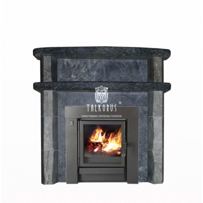 Портал в баню выполнен в скандинавском стиле из талькомагнезита с декоративными элементами из рваного (дикого) камня и массивными полками.