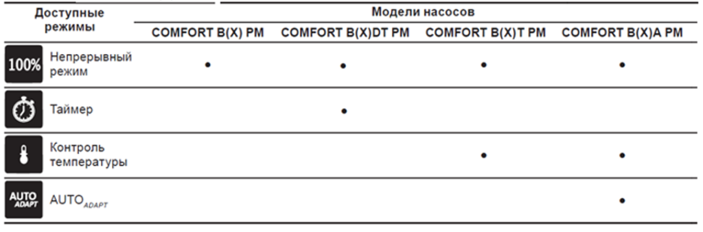- AUTOADAPT – максимально энергосберегающий режим. Насос анализирует график водопотребления и включается за 20 минут до предполагаемого открытия крана. Использует два датчика температуры. Период обучения – 2 недели (в это время работает в режиме контроля температуры)