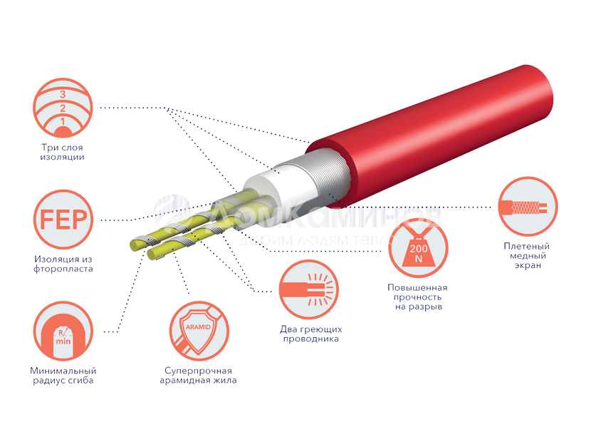 Конструкция позволяет перегибать кабель без риска обрыва или слома жил. Это достигается за счёт уникальной конструкции тонких витых греющих жил, длина которых превосходит длину кабеля на 6%. При любых деформациях или растяжениях основная нагрузка приходится на арамидную жилу, а греющие проводники легко адаптируются к изменению радиуса сгиба.