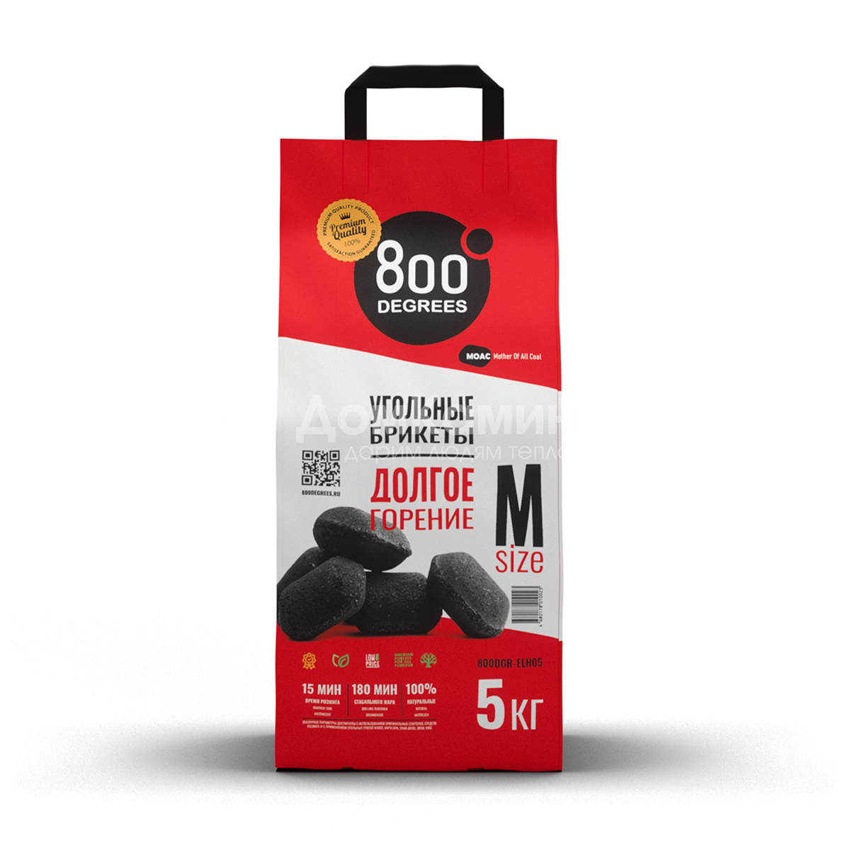 Угольные древесные брикеты 800 Degrees Extra Long Heat в многослойных, плотных бумажных мешках с удобной ручкой для переноски. Производятся по собственной технологии и рецептуре из плодовых и лиственных пород деревьев. Вся продукция рекомендована для приготовления пищи Русским Обществом Барбекю (РОБ) к применению во всех типах угольных и дровяных грилей, хосперах, а также в мангалах, печах и очагах.