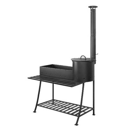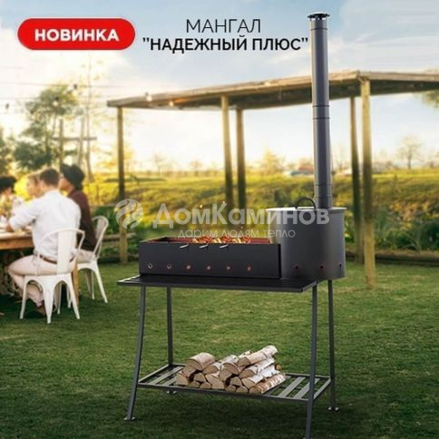 Мангал "Надежный Плюс" получил свое название из-за того, что произведен из 6мм котловой стали, покрытый термостойкой кремнийорганической эмалью, также особенностью мангала является печь под казан с высокой вытяжной трубой самоварного типа. На мангале можно одновременно готовить пищу на шампурах и в казане. Так как мангал стационарный для защиты от осадков в комплекте поставляется крышка для мангальной вставки и печи под казан.
