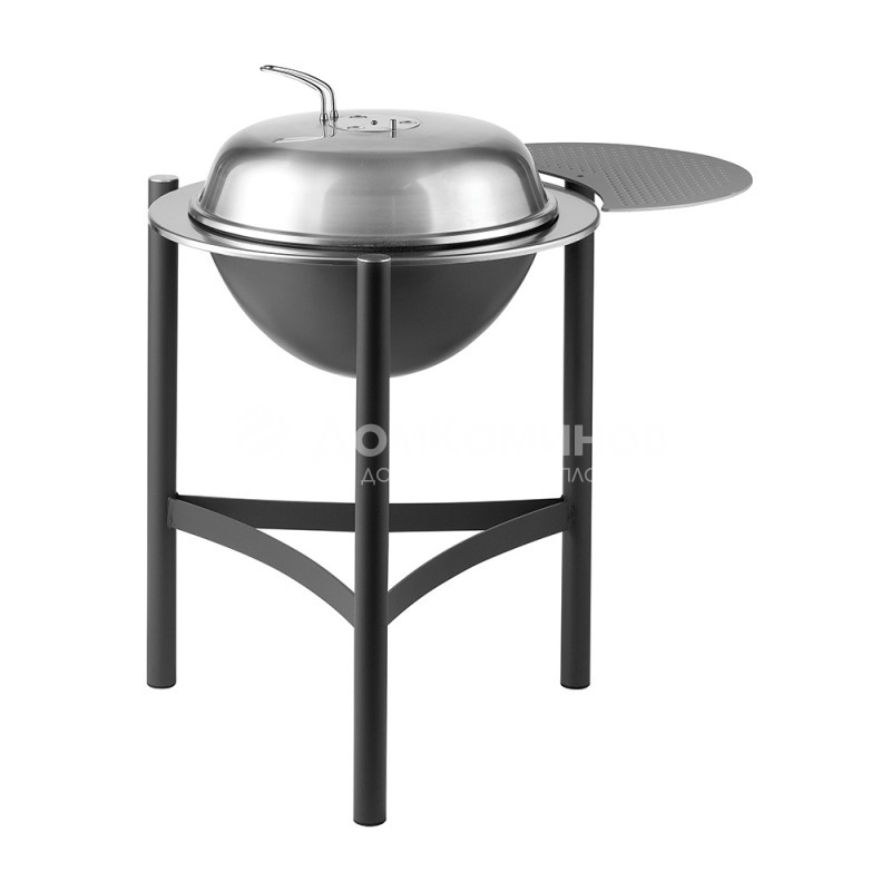 Решетка из нержавеющей стали толщиной 6 мм. В крышку встроен термометр. Ненагревающаяся ручка на крышке и удобная заслонка поддува с крупными отверстиями. Сам котел устанавливается на цельную алюминиевую раму покрытую защитным напылением и дополнен боковым столиком из литого алюминия.