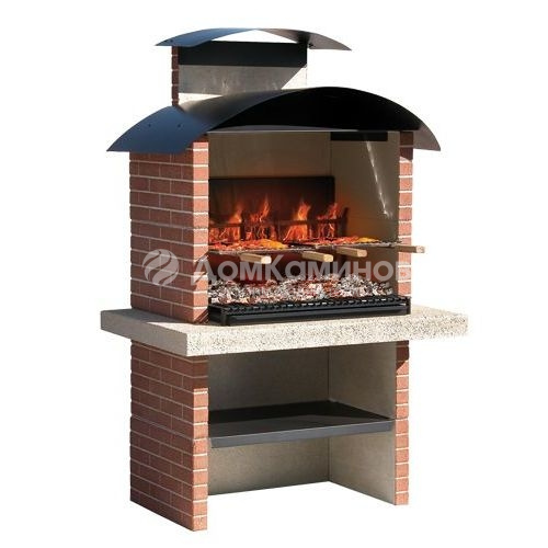 Барбекю из гранулированного мрамора, выполненное в естественных тонах. Передние панели изготовлены из стали черного цвета, боковины с обработкой под декоративный кирпич, вытяжка - из нержавеющей стали черного цвета. Столешница обработана с использованием технологии полирования Crystal.