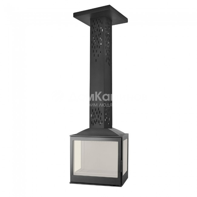 Камин с фронтальным и боковыми стеклами (правое и левое), трехсторонний обзор огня. Поставляется с трубой и комплектом крепления к потолку. Материал - чугун.