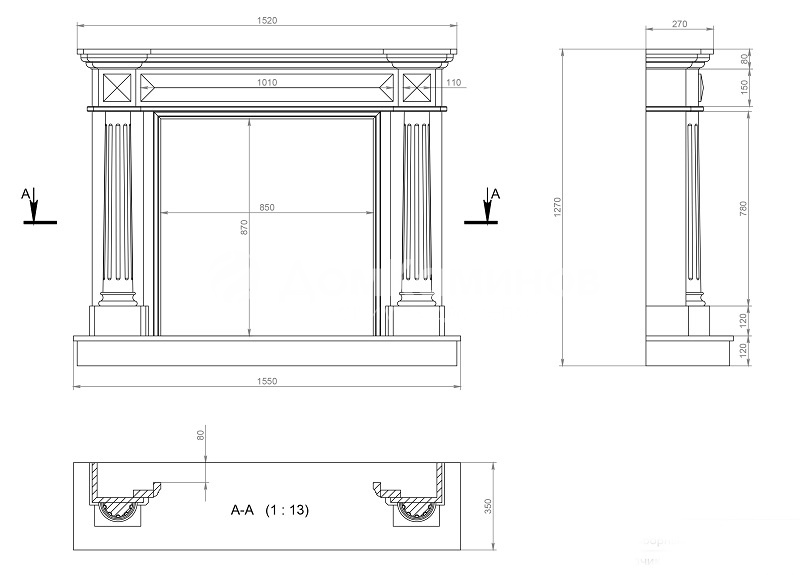 Каминный портал имеет размеры 156 x 130 x 35 см и украсит ваш каминный зал или гостиную. Максимальные внутренние размеры порталы соответствуют топки 86 x 90 см.