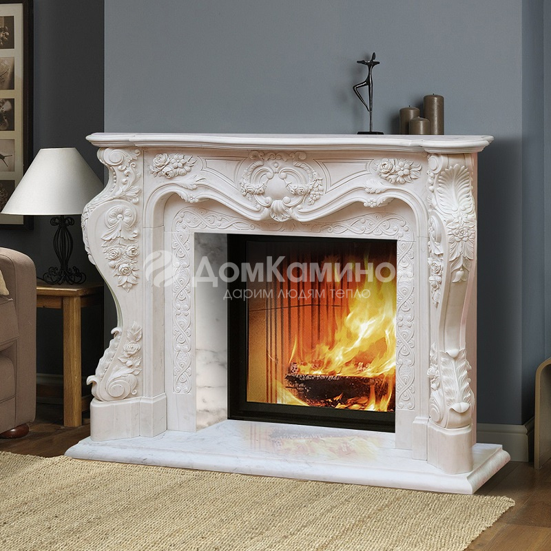 Модель изготовлена из светлого мрамора . Портал для камина предназначен для отделки каминных топок. Стоит обратить внимание на плоские топки. Такой тандем создаст иллюзию открытого очага. Кроме того, такие модели топочных камер не нарушат общей декоративной целостности модели.