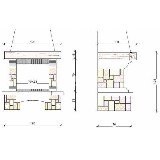 Природный камень доломит, Нижние полочки и капители из песчаника, балка массив дуба, клинкерный кирпич Feldhaus