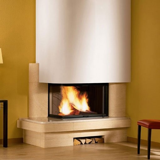 Угловой камин Opus в стиле модерн из камня Дордонь или из белого камня Прованс. Пластина из кремового мрамора Марфил или черного Маркина на выбор. Кожух на выбор.