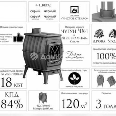 Корпус печи камина Печь Бахта выполнен из чугуна. Чугун термостойкий и недорогой материал. Он слабо расширяется при нагреве, обеспечивает высокую теплоотдачу и мягкое излучающее тепло. Чугунную печь надо ставить дальше от горючих материалов и хорошо изолировать стены. Печи мощные и излучение тепла на расстоянии 1 метра проникающее.