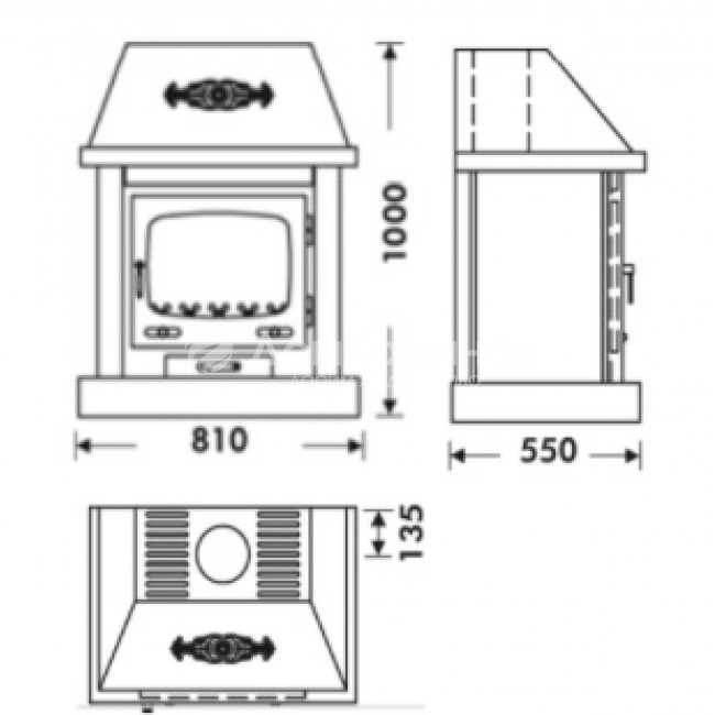 Корпус печи изготовлен из стали. Мощность печи составляет 11 кВт, что достаточно для отопления помещения до 240 м3. Стеклокерамическая дверка выдерживает температуру до 750оС. Диаметр дымоходной трубы 150 мм.