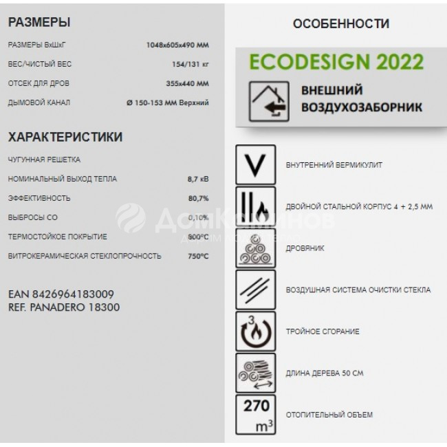 Корпус печи изготовлен из стали. Мощность печи составляет 11 кВт, что достаточно для отопления помещения до 275 м3. Стеклокерамическая дверка выдерживает температуру до 750оС. Диаметр дымоходной трубы 150 мм.