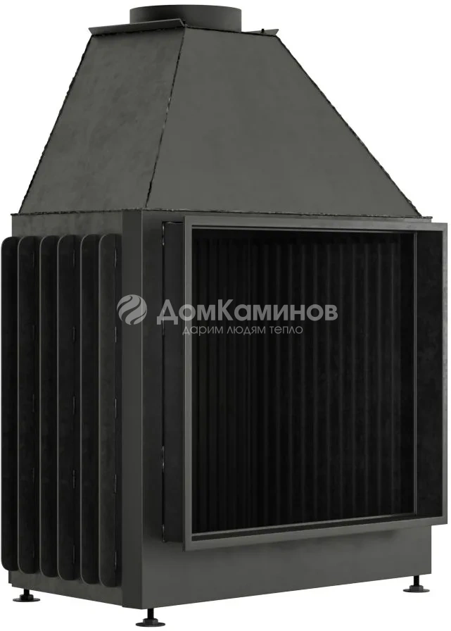Футеровка из 3D-панелей. Отделка вертикальных стенок топки ребристыми стальными панелями черного цвета. Панели с усиленной конструкцией и воздушным зазором. Это позволяет распределять тепло равномерно по всему очагу и защищать его корпус от прямого воздействия огня. Кроме того, черный цвет панелей позволяет не беспокоится о следах сажи на стенках, остающихся после длительной эксплуатации.