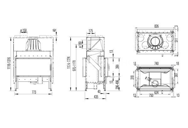 Дверца с двумя прямыми стеклами (сквозная топка, туннельного типа) поверх рамки с трафаретной печатью. Боковое открывание дверцы влево /вправо. Ширина стекла 750мм, высота 390мм.