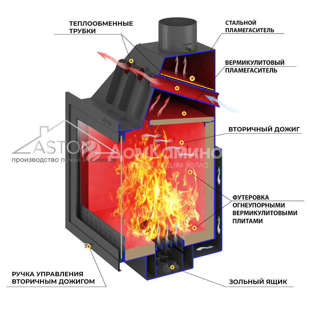 Трубы, размещённые над топочной камерой в области дымосборника, увеличивают скорость движения нагретого воздуха и усиливают конвекционные возможности каминной топки АСТОН 700.