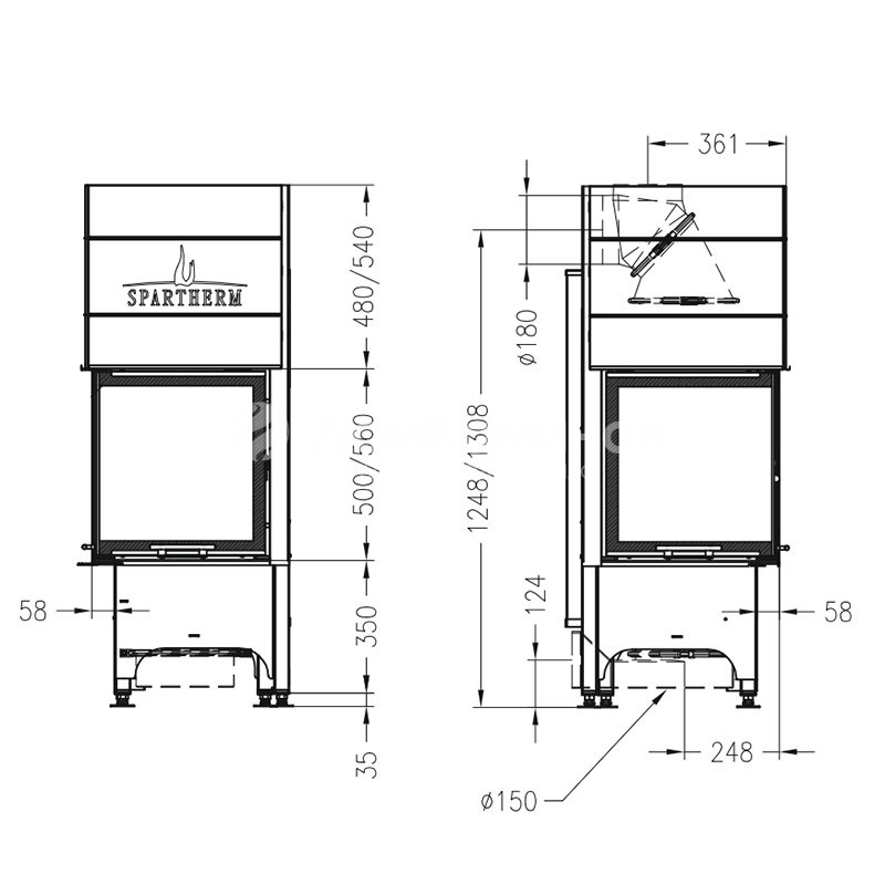 Каминная топка Spartherm Mini 2LRH 4S из стали толщиной 4/5 мм с антикоррозийным покрытием. Дверца с 2х сторонним керамическим прямоугольным стеклом, вытянутым вверх, которая открывается вбок. Шамотный кирпич внутри топки увеличивает температуру в топке, накапливает это тепло во время работы топки, и длительное время излучает его после окончания процесса горения.