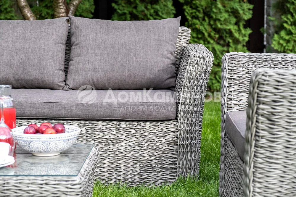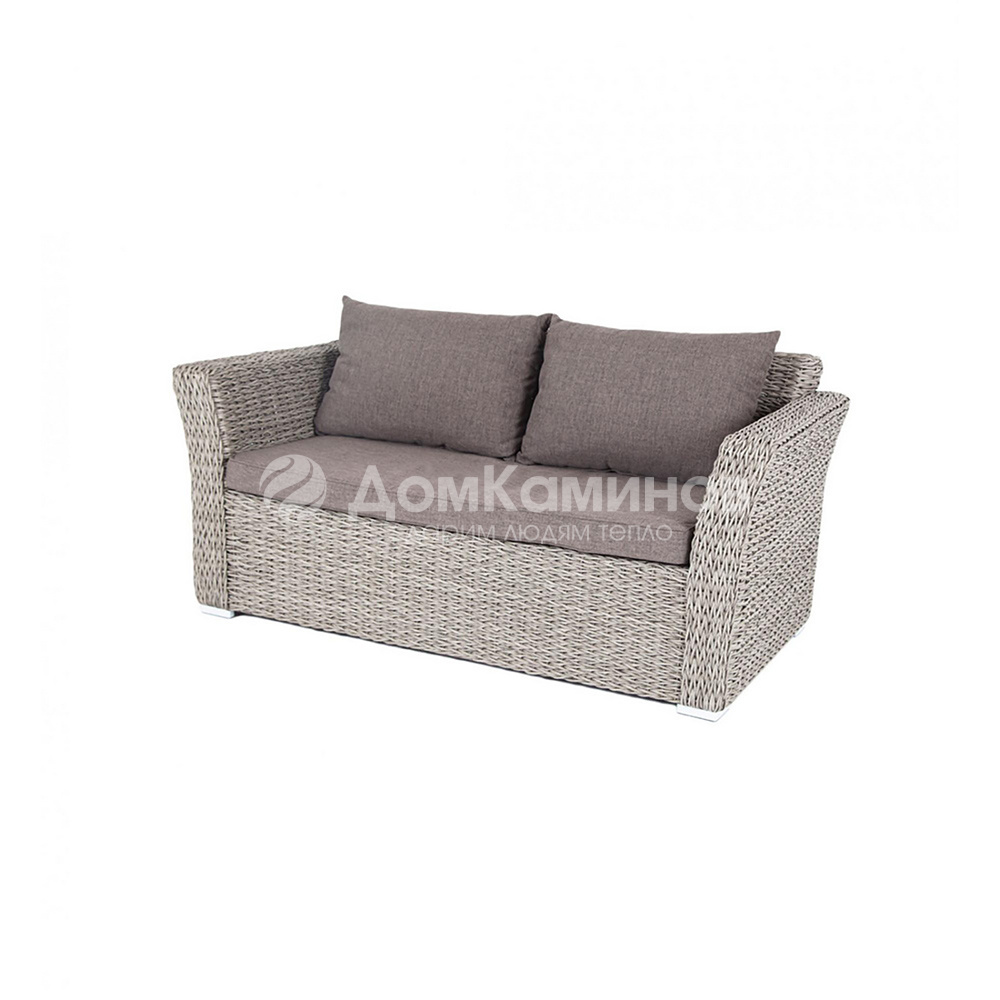 Диван «Капучино» двухместный с каркасом из прочного алюминия.Размер модели – 1700×850×810 мм.Диван выполнен из искусственного ротанга вида "гиацинт" цвета графит, оплетенного вручную.Двухместный диван дополнен несколькими подушками со съемными темно-серыми чехлами. Они изготовлены из прочного полиэстера, плотность которого достигает 230гр/м2. Предусмотрена влагоотталкивающая пропитка ткани для защиты текстильных изделий от намокания.