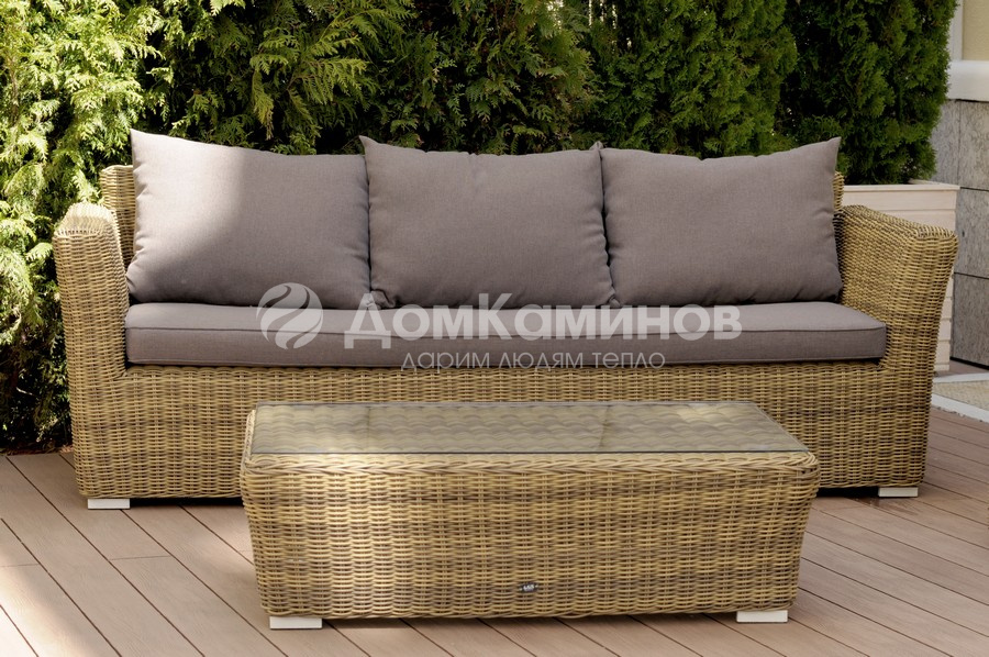 Диван «Капучино» предназначается для размещения трех человек. Его основание изготовлено из алюминиевого каркаса, способного выдерживать большие нагрузки. Мебель декорирована ручным круглым плетением, выполненным из искусственного ротанга соломенного цвета. Трехместный диван укомплектован мягкими подушками, которые защищены съемными чехлами в темно-сером оттенке. При их пошиве используется износостойкий полиэстер, плотность которого достигает 230гр/м2. Предусмотрена влагоотталкивающая пропитка.