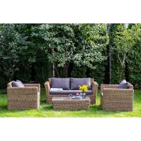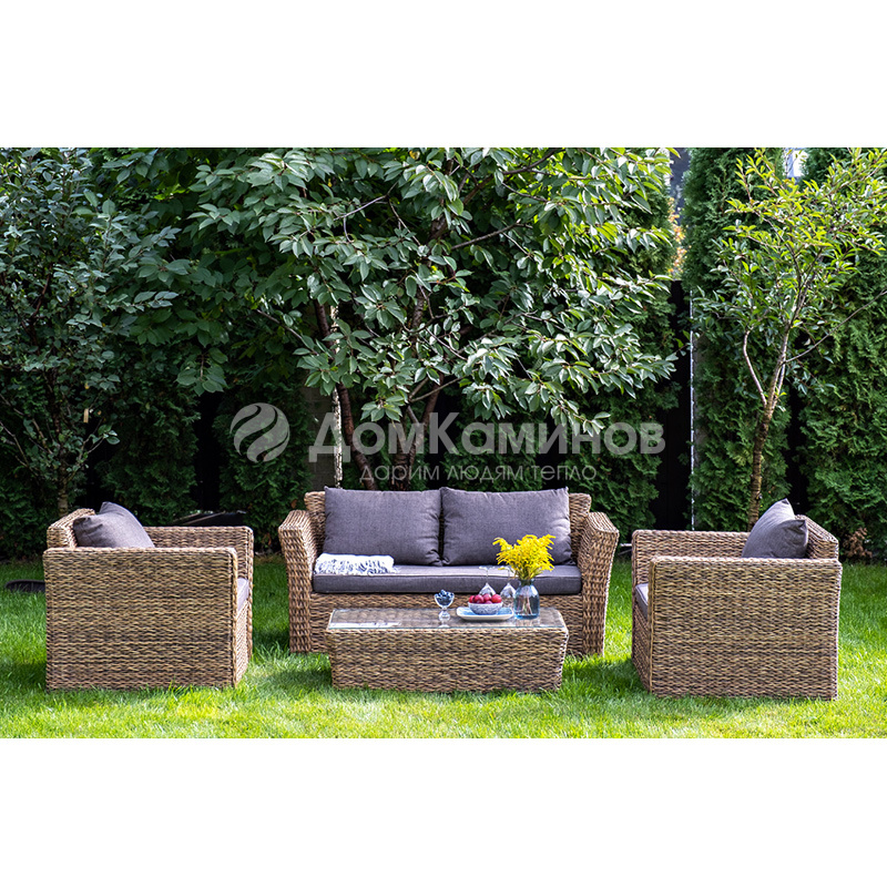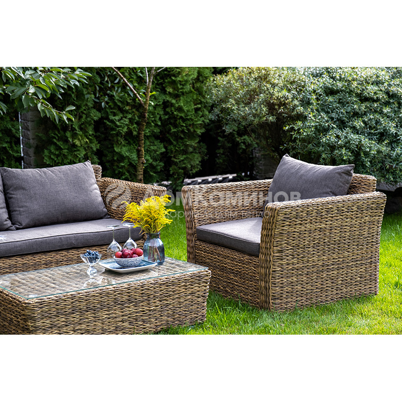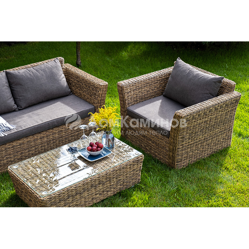 Лаунж-зона «Капучино Сингл» на 4 персоны. Она включает в свой состав:- два кресла (размер – 1050×850×810 мм)- плетеный журнальный столик (размер – 1100×660×300 мм)- двухместный диван (размер – 1700×850×810 мм).Прочный алюминиевый каркас усиливает устойчивость мебели. Его дополняет соломенная оплетка, которая представлена из искусственного ротанга вида "гиацинт".Более комфортной лаунж-зону делают мягкие подушки с чехлами из серого полиэстера. Его плотность находится в рамках 230гр/м2. Ткань предварительно обрабатывается влагоотталкивающими составами.Столешница журнального столика также входит в комплект и поставляется в собранном виде с самим столиком. Она изготовлена из закаленного стекла – 5 мм.