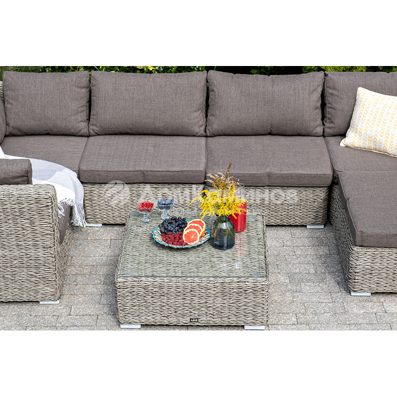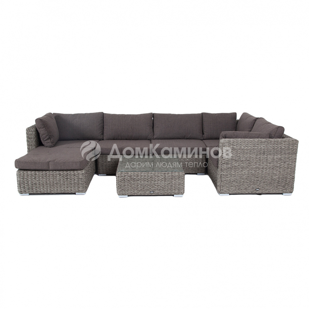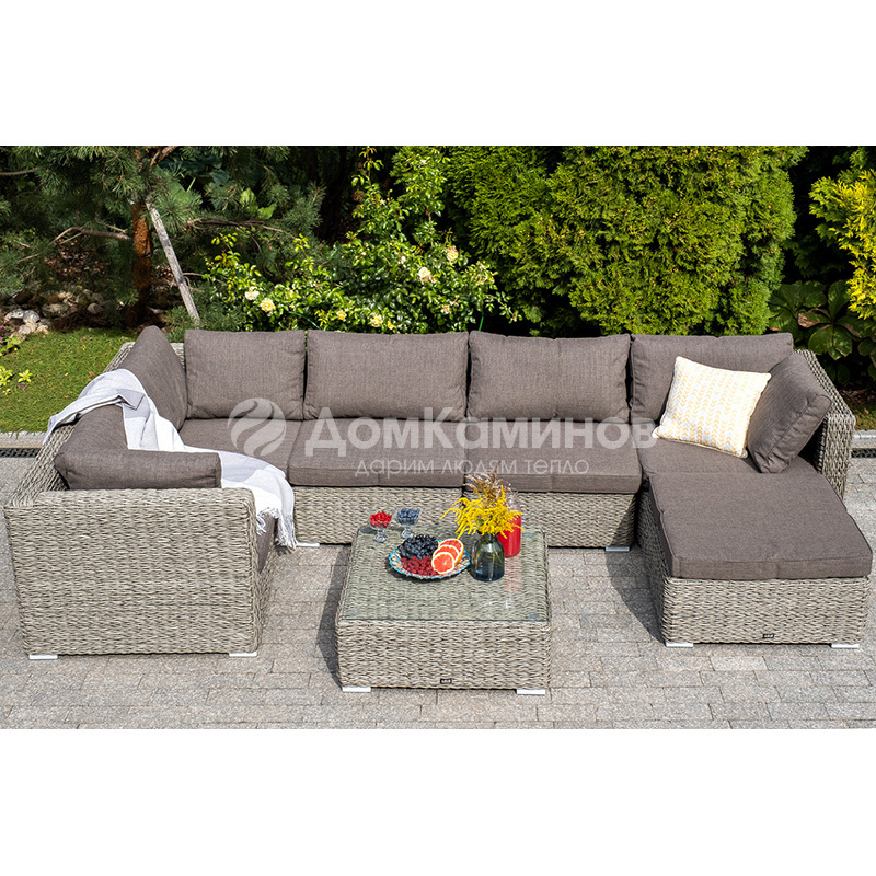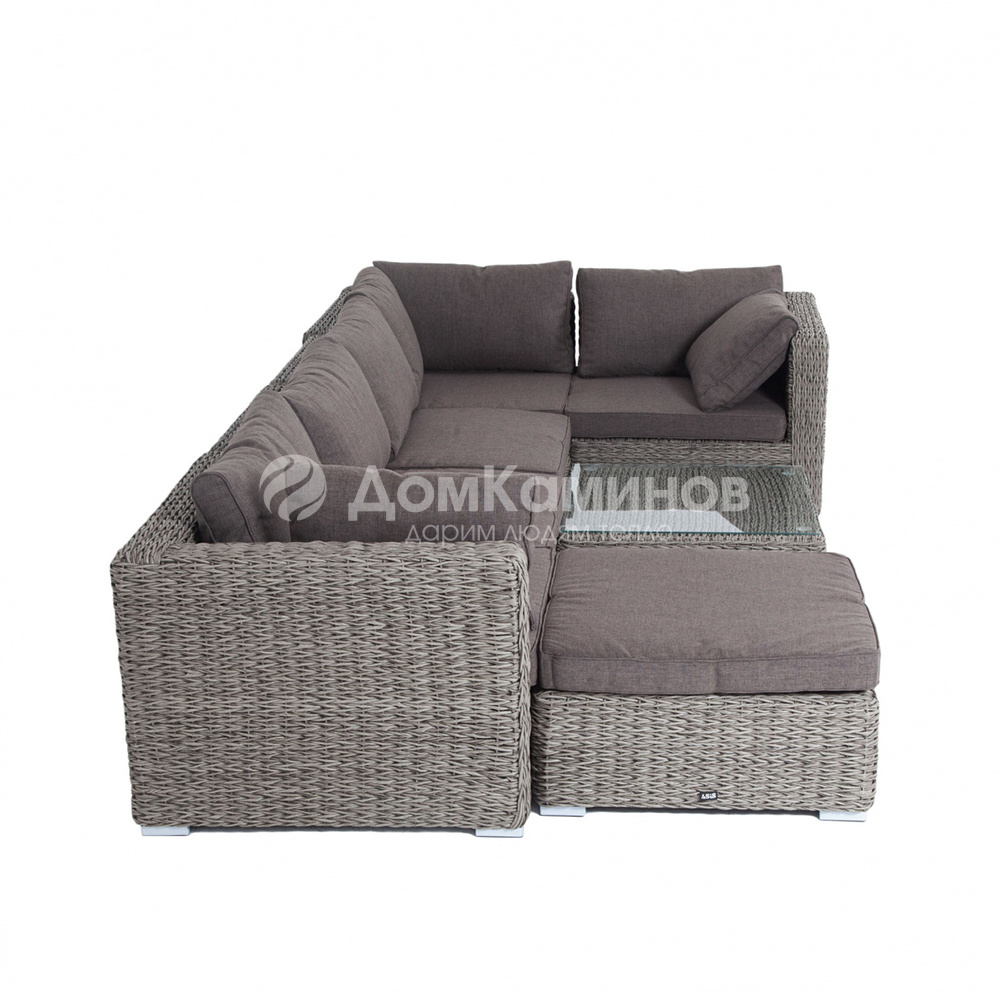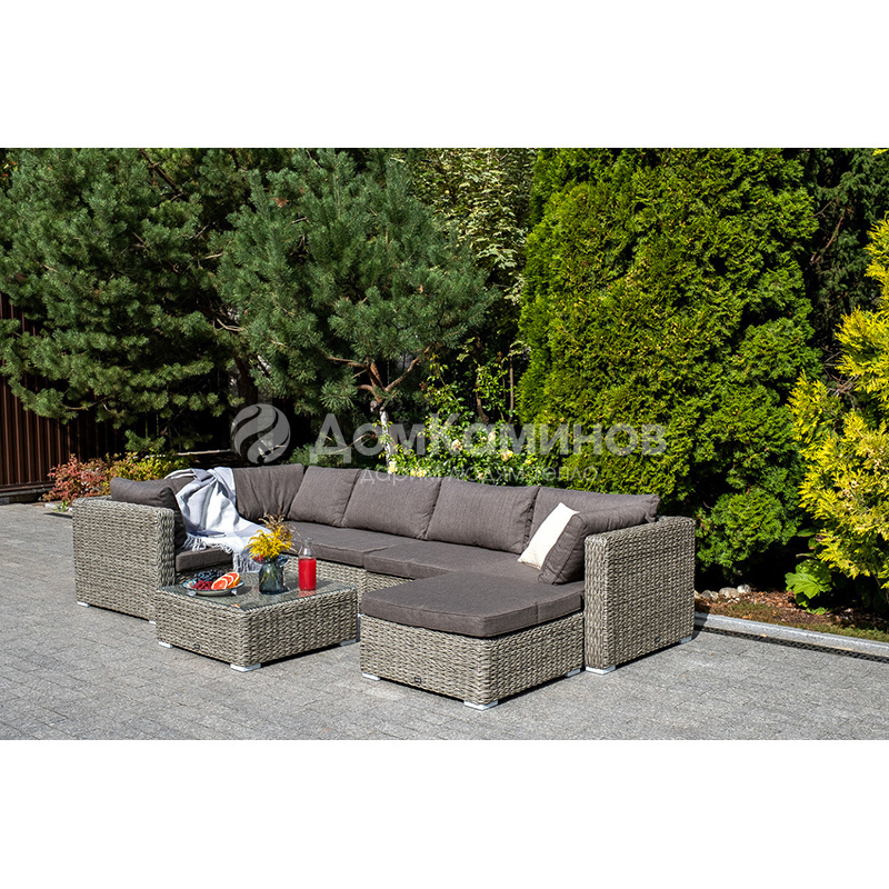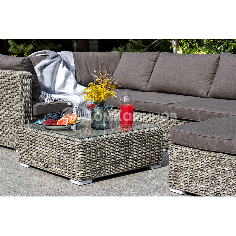 Стильная трансформирующаяся лаунж-зона «Лунго», состоящая из- трех угловых модулей - 850×850×670 мм- двух прямых модулей - 850×730×670 мм- оттоманки - 730×730×330 мм- журнального столика - 730×730×330 ммОблегченный алюминиевый каркас, вручную оплетенный искусственным ротангом натурального графитового оттенка вида "Гиацинт". Журнальный столик с прочной стеклянной столешницей толщиной 5 мм.Благодаря различным конфигурациям модулей диваны легко трансформировать и комбинировать в том расположении, которое нужно для вашего объекта.Вы также можете купить некоторые модули по отдельности, чтобы увеличить или уменьшить количество посадочных мест.