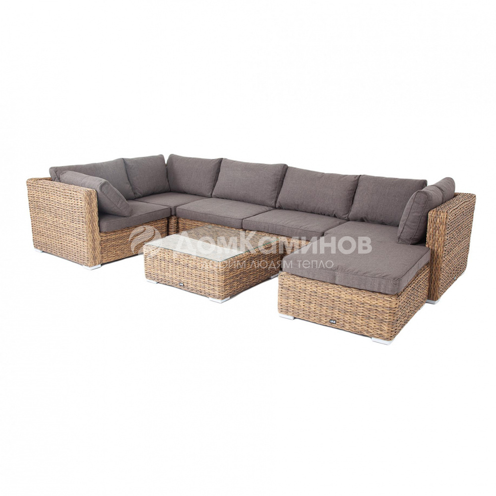 Стильная трансформирующаяся лаунж-зона «Лунго», состоящая из- трех угловых модулей - 850×850×670 мм- двух прямых модулей - 850×730×670 мм- оттоманки - 730×730×330 мм- журнального столика - 730×730×330 ммОблегченный алюминиевый каркас, вручную оплетенный искусственным ротангом натурального соломенного оттенка вида "Гиацинт". Журнальный столик с прочной стеклянной столешницей толщиной 5 мм.Благодаря различным конфигурациям модулей диваны легко трансформировать и комбинировать в том расположении, которое нужно для вашего объекта.Вы также можете купить некоторые модули по отдельности, чтобы увеличить или уменьшить количество посадочных мест.