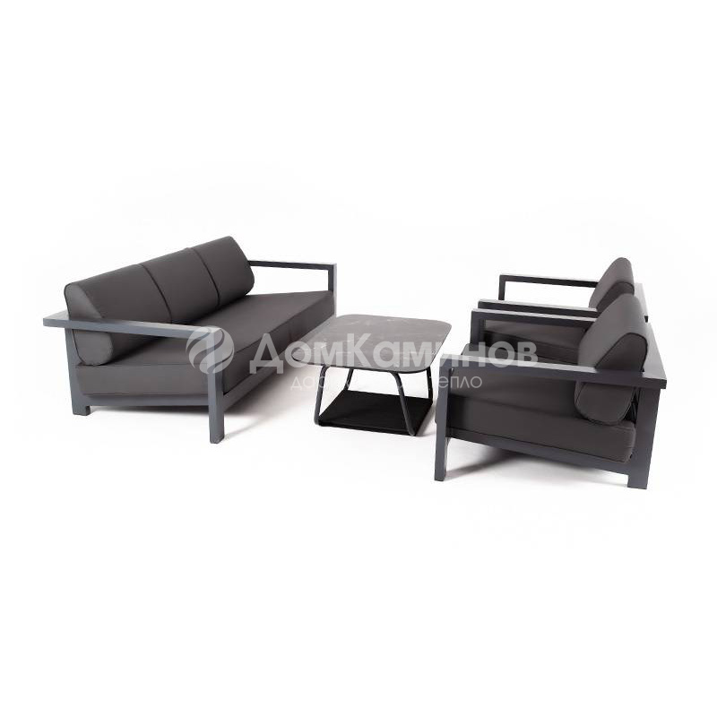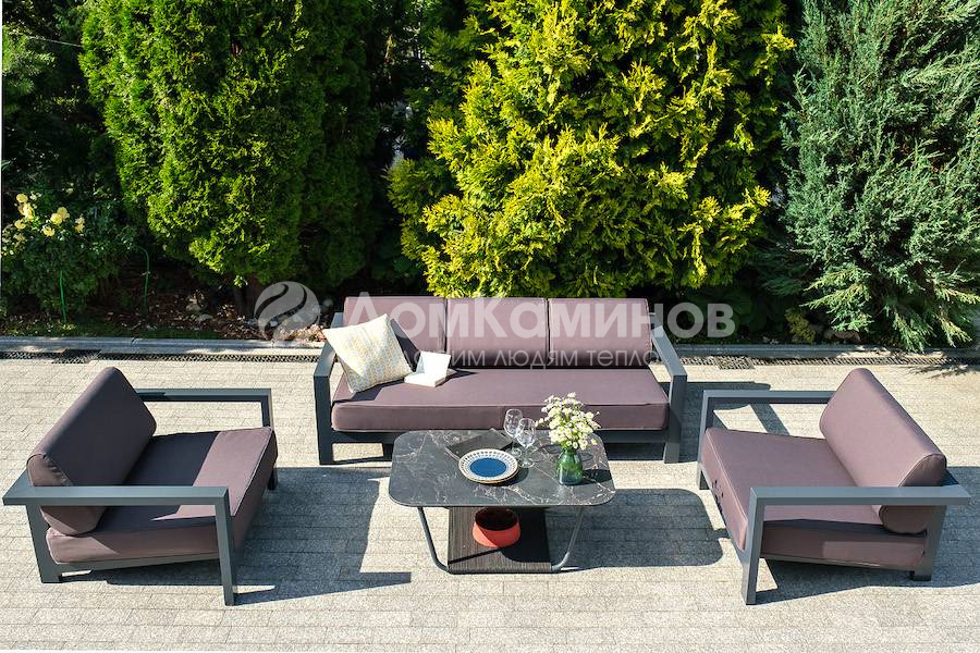 Каркас мебели выполнен из алюминиевого профиля, окрашенного в темно-серый (RAL7024) цвет. Дополняют комплект подушки со съёмными чехлами.