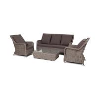 Вместительная лаунж-зона «Гляссе» состоит из:- трехместного дивана – 1900×900×980 мм- двух кресел – 900×730×980 мм- журнального столика – 1100×660×300 мм.Модели имеют алюминиевый каркас, который оплетен вручную искусственным ротангом.Плетеная мебель дополнена удобными подушками в серых чехлах. При их изготовлении используют полиэстер, плотность – 230гр/м2. Он обрабатывается влагоотталкивающей пропиткой для повышения защитных свойств материала.Журнальный столик оснащен пластиковыми ножками и столешницей из закаленного стекла толщиной 5 мм.