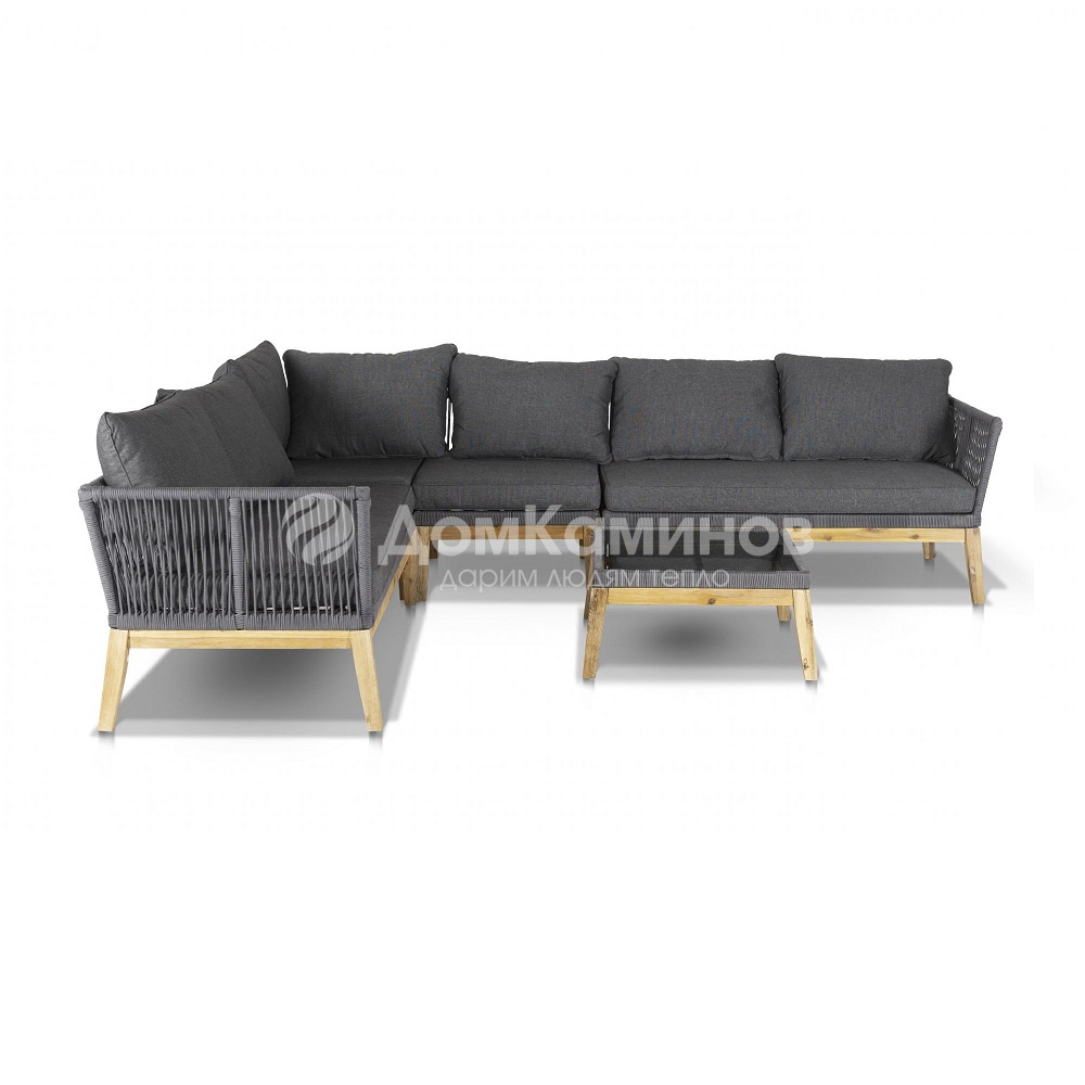 "Барселона" модульная лаунж зона, деревянный каркас из акации, оплетен вручную эластичными синтетическими лентами из высокопрочных полиэфирных волокон, в состав комплекта входит: два боковых модуля (правый/левый) 1400 х 750 х 660 мм, угловой модуль 750 х 750 х 660 мм, центральный модуль 650 х 750 х 660 мм, стол кофейный из акации 650 x 650 x 330 мм. Модули оснащены подушками серого цвета со съемными чехлами.