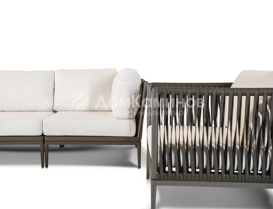 Касабланка модульная лаунж зона на 6 персон. Ручное плетение из тканевых синтетических шнуров. Подушки белого цвета в комплекте. Алюминиевый каркас. Журнальный столик со стеклянной столешницей толщиной 5 мм.