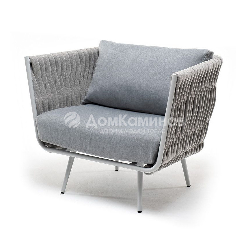 Плетеное кресло «Монако» для обустройства обеденной или лаунж-зоны.Изготовлен из алюминиевого каркаса, оплетенного вручную эластичными синтетическими лентами из высокопрочных полиэфирных волокон. Цвет каркаса и оплетки – светло-серый.Подушки состоят из наполнителя и съёмных чехлов, которые обработаны влагоотталкивающей пропиткой светло-серого (RAL7035) цвета.