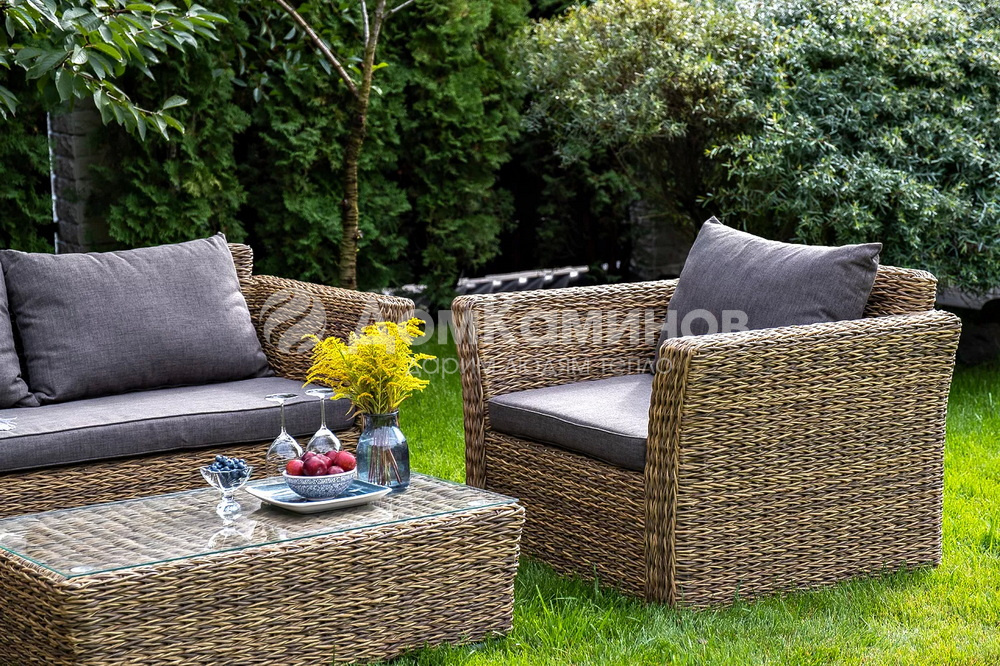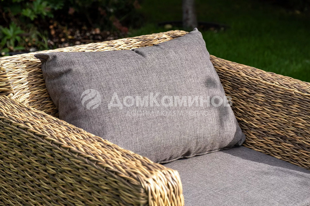 Каркас изготовлен из прочного алюминия, оплетенного вручную искусственным ротангом вида "гиацинт" соломенного оттенка.