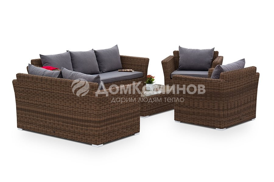Кресло «Капучино» является практичным дополнением зоны отдыха, обустроенной мебелью из этой же серии. Размер модели – 1050 х 850 х 810 мм. Ее отличает алюминиевый каркас высокой прочности. В качестве декоративной составляющей выступает ручное плетение на основе искусственного ротанга. Оно выполнено в коричневом оттенке.