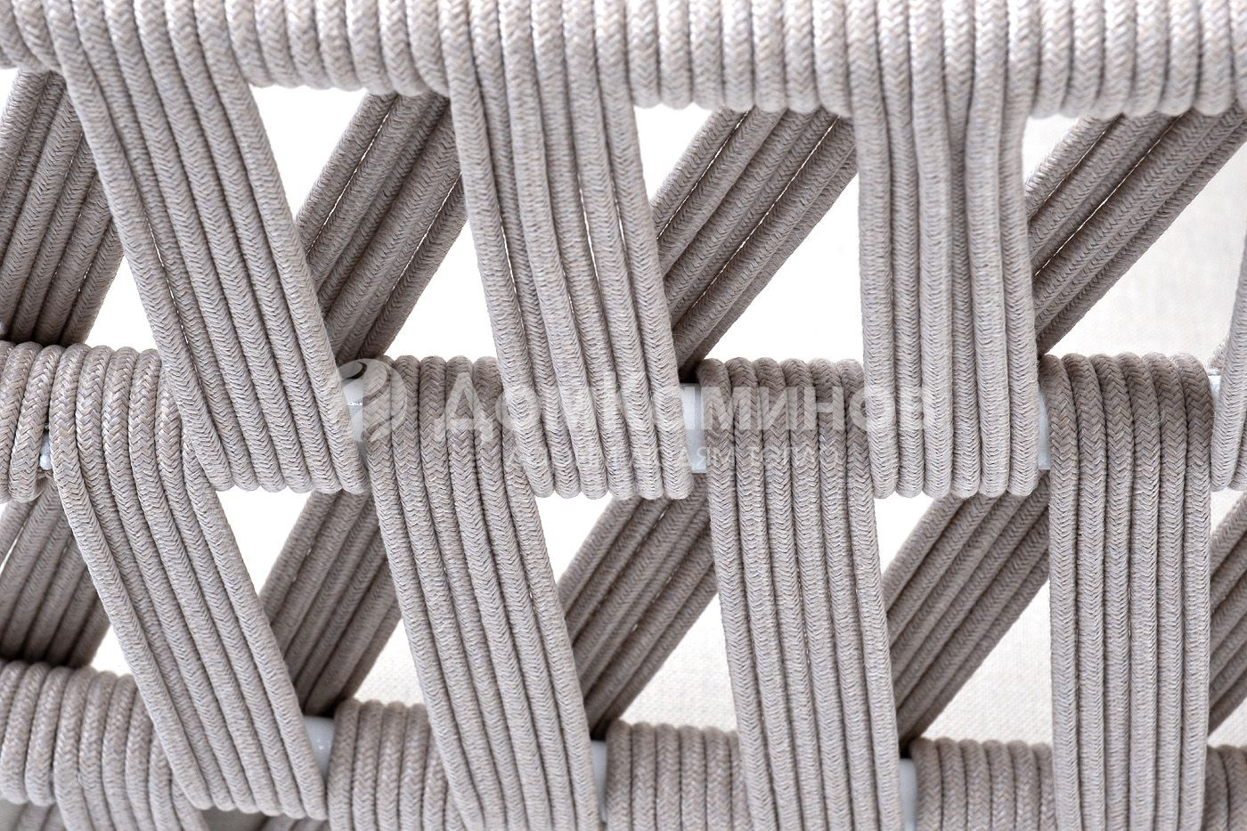 Плетеное кресло «Диего» с подушками в комплекте.Основание кресла - дуб, каркас из алюминия светло-серого (RAL7035) цвета.Боковины каркаса вручную оплетены роупом - эластичными синтетическими лентами, изготовленными из высокопрочных полиэфирных волокон. Цвет оплетки - бежевый.Подушки со съёмными чехлами, которые обработаны влагоотталкивающей пропиткой. Материал - 100% полиэстер, плотностью 300гр/м2.