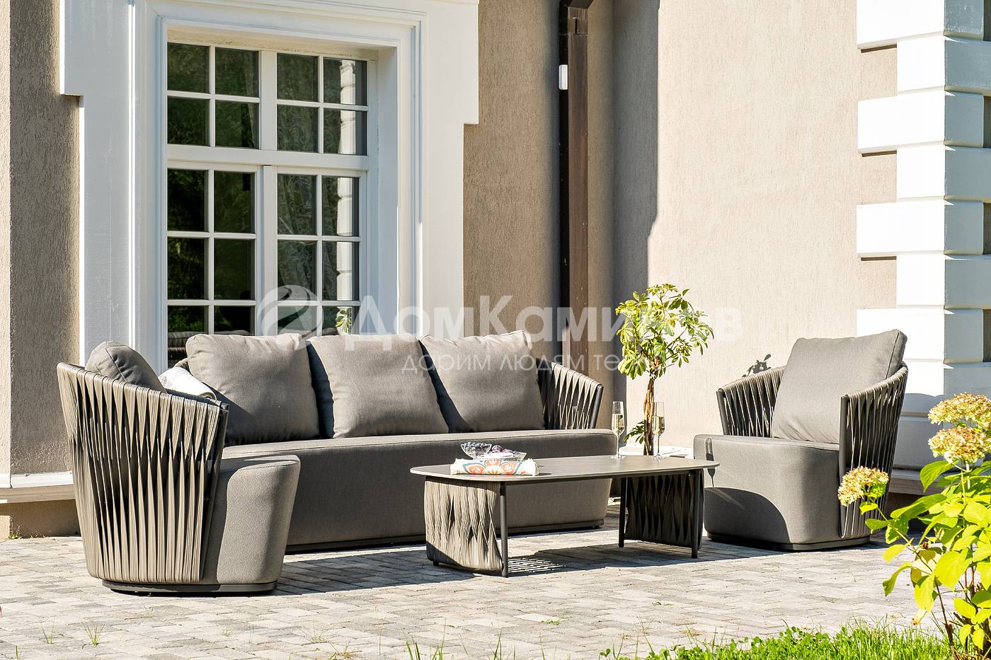 Плетеная мебель дополнена удобными подушками в графитовых чехлах. При их изготовлении используют полиэстер, плотность – 300гр/м2. Он обрабатывается влагоотталкивающей пропиткой для повышения защитных свойств материала.