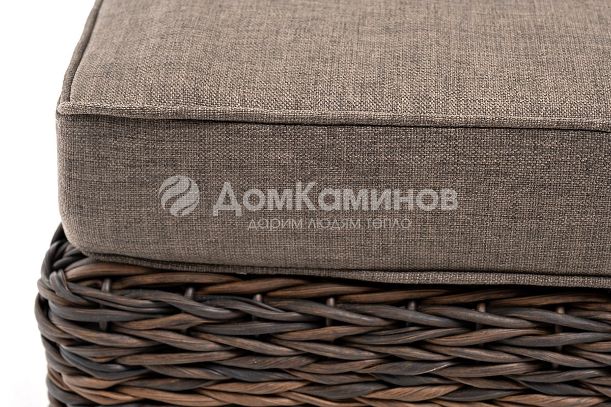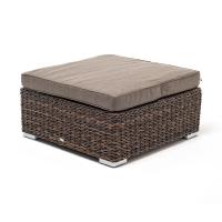 Оттоманка без спинки «Лунго» представлена в коричневом цвете. Размер модели – 740×740×380 мм. Высота без подушки - 300 мм.Она имеет каркас из алюминия высокой прочности. Для изготовления используется ручное плетение вида "гиацинт", выполненное из искусственного ротанга. Оттоманка может служить в комплекте с трансформирующимся диваном «Лунго».Предмет мебели дополняется мягкой подушкой в съемном чехле серого цвета. При пошиве берется полиэстер с плотностью 230гр/м2. Предусмотрена влагоотталкивающая пропитка, которая защищает изделие от влаги.