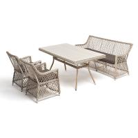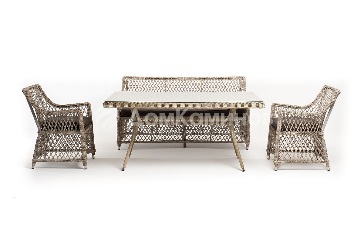 Все предметы мебели изготовлены из прочного алюминия, вручную оплетенного долговечным искусственным ротангом. На креслах и диване предусмотрены подушки со съемными чехлами и влагостойкой пропиткой. Стол укомплектован прочным стеклом толщиной 5 мм для удобства использования.