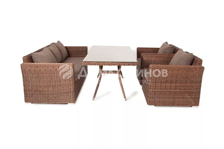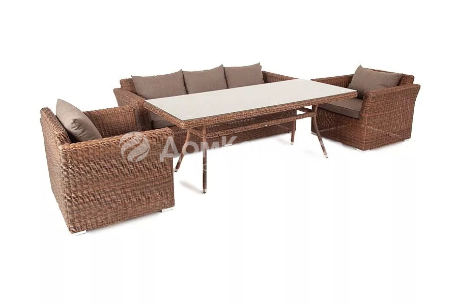 В комплект обеденной группы входит один обеденный стол, один трехместный диван, два кресла и подушки.