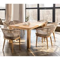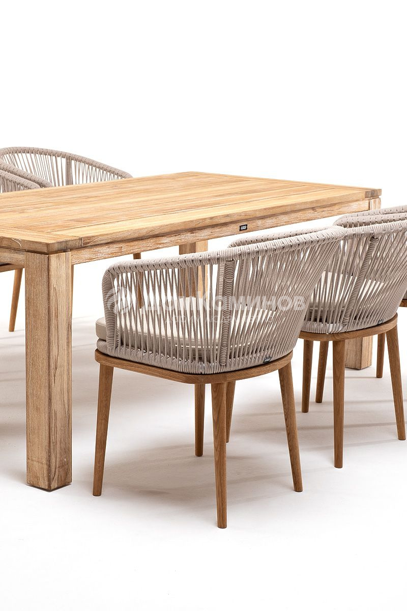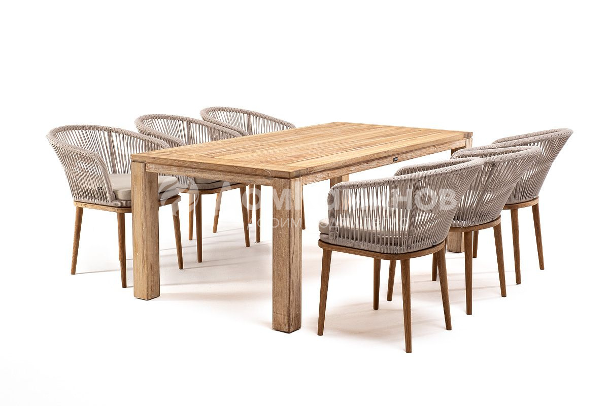 Комплект "Мадейра" для обустройства обеденной зоны, рассчитан на 6 персон.В комплект входят:- стол тиковый "Витория" 2000×1000×770 мм- 6 стульев "Марсель" - 570×620×830 ммСтол "Витория" выполнен из прочного натурального тикового дерева. Мебель ручной работы с максимальным сохранением естественного рисунка дерева. Цвет – натуральный с характерным природным узором.Каркас стульев выполнен из натурального дерева - дуб. Оплетка выполнена вручную современным материалом - роупом. Это эластичные синтетические веревки из высокопрочных полиэфирных волокон, предназначенные для изготовления мебели. Цвет оплетки - бежевый. В комплект входят подушки со съёмными водоотталкивающими чехлами бежевого цвета.