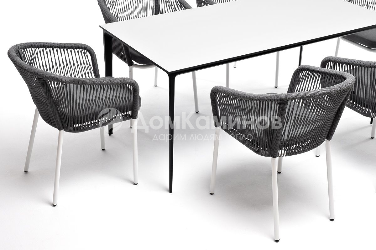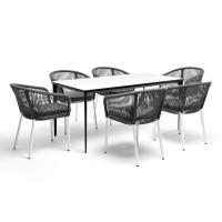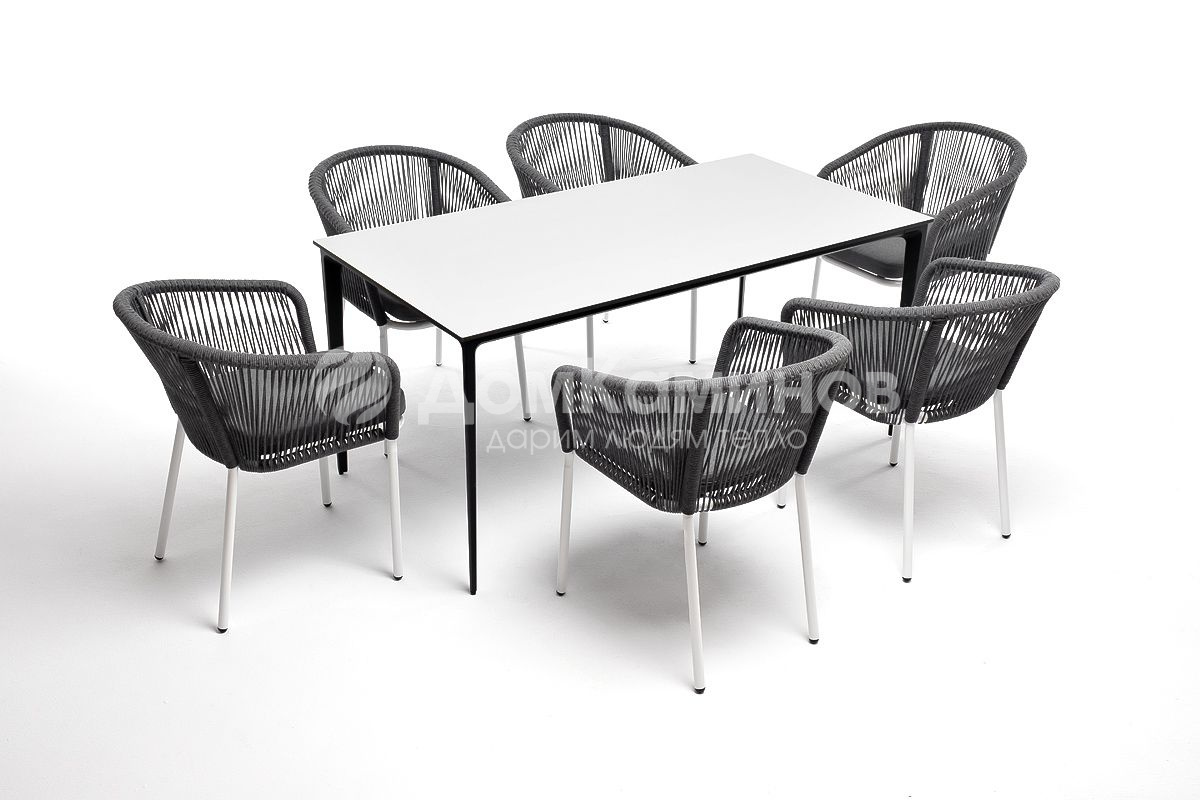 Обеденная группа «Малага» рассчитана на 6 персон.В состав комплекта входит:- Стол "Малага" со столешницей из HPL-пластика, размер столешницы - 1400х800 мм, цвет - молочный. Высота стола - 750 мм- 6 плетеных стульев "Марсель" из роупа, размером - 570х620х775 мм, цвет роупа - светло-серый, каркас - белый.