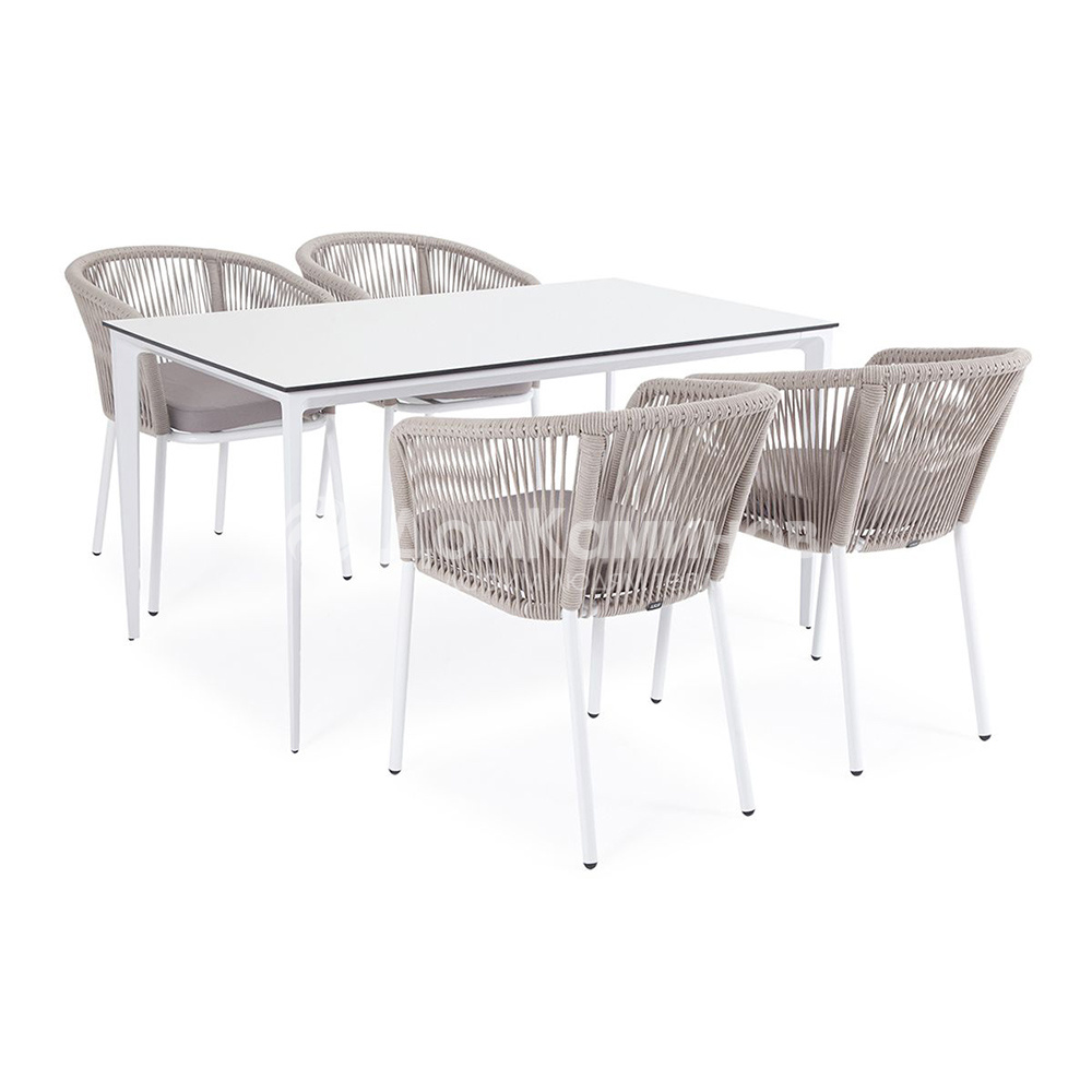Обеденная группа «Малага» рассчитана на 4 персоны.В состав комплекта входит:- Стол "Малага" со столешницей из HPL-пластика, размер столешницы - 1400х800 мм, цвет - молочный. Высота стола - 750 мм- 4 плетеных стула "Марсель" из роупа, размером - 570х620х775 мм, цвет роупа - бежевый, каркас - белый.