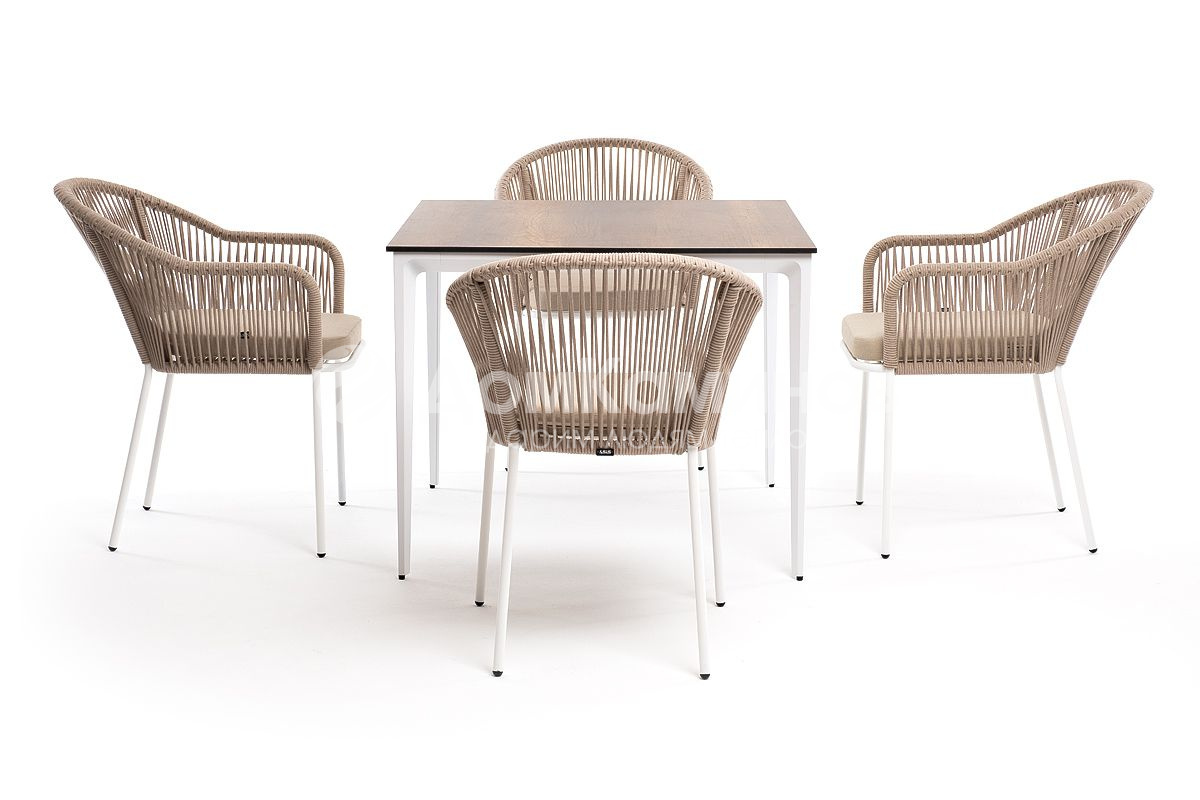 Обеденная группа «Малага» рассчитана на 4 персоны.В состав комплекта входит:- Стол "Малага" со столешницей из HPL-пластика, размер столешницы - 900х900 мм, цвет - "дуб". Высота стола - 750 мм- 4 плетеных стула "Лион" из роупа, размером - 570х620х820 мм, цвет роупа - бежевый, каркас - белый.